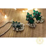 Emerald Green Oxidized German Silver Jewelry Set with Monalisa StoneTransform into royalty with this mesmerizing emerald leaf jewelry set. Handcrafted...